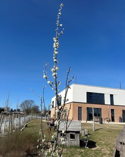Die Kinder und Erzieher*innen der Campus-Kita Werden haben gemeinsam einen Pflaumenbaum auf dem Campus gepflanzt. Nun freuen sich alle über seine wunderschöne Blüte.