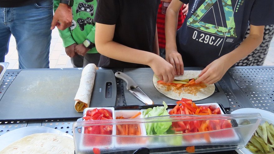 Kinder aller Klassenstufen ließen sich auf das Experiment ein, nur mit Gemüse und Obst zu grillen. Am 7. September wurde den gesamten Schultag über geschnippelt, gegart, gegrillt, angerichtet und natürlich gegessen! Und: Es geht auch ohne Fleisch! Das konnten die Kinder gemeinsam feststellen. Es gab Gemüse-Tortillas, Wokgemüse, Kidneybohnen-Burger, Flammkuchen und ein Obstcrumble mit Eis. Sogar den Nachtisch haben die Kinder auf dem Grill gezaubert. Besonders beliebt waren die Flammkuchen und das Obstcrumble.