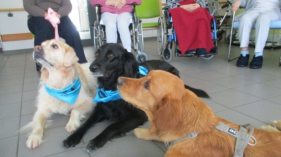 „Quinn“, ein gemütlicher Golden Retriever, machte den Anfang und kommt seitdem regelmäßig zu uns. Mit seiner ruhigen, freundlichen Art eroberte er im Nu alle Herzen. Er beherrscht einige Kunststücke, spürt versteckte Gegenstände auf und kann sogar Socken ausziehen. Und manchmal bringt Quinn auch tierische Freunde mit - dieses Mal waren es seine kleine Schwester Welpe Freddy und Casey.