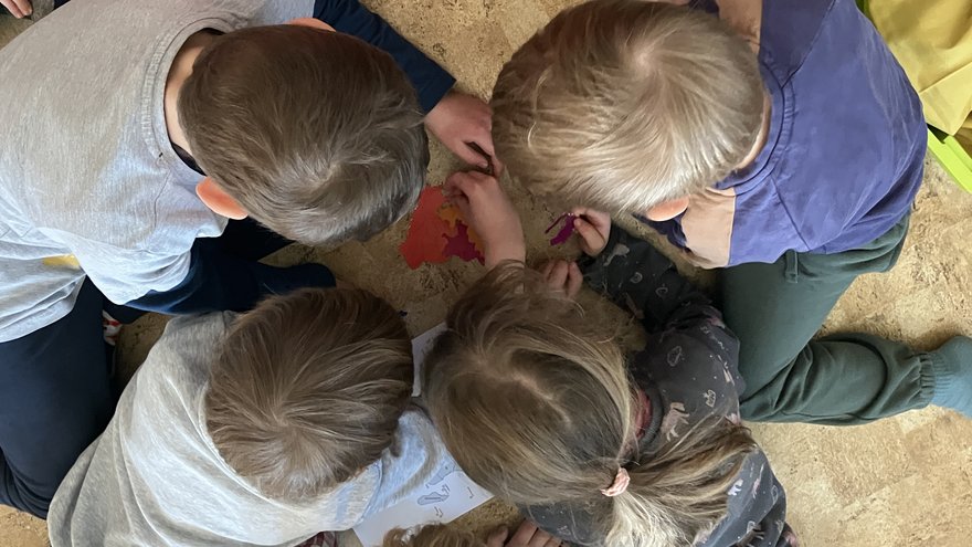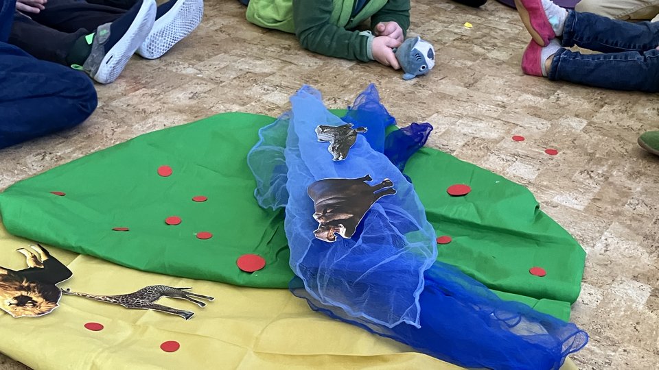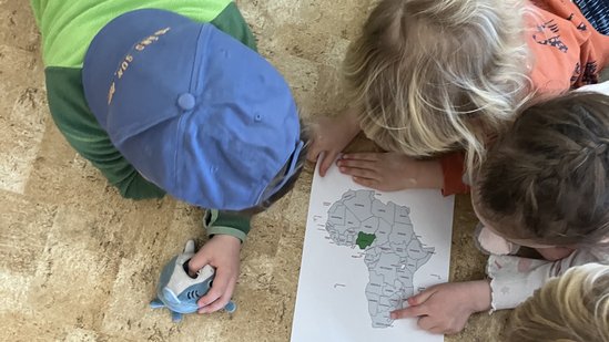 Zum Einstieg setzten die Kinder gemeinsam aus vielen einzelnen Teilen gemeinsam ein großes Puzzle des Kontinents Afrika zusammen. Dabei entdeckten die Kinder, wo Nigeria liegt und wie weit dieses Land von Deutschland entfernt ist. Anschließend gestalteten wir ein Bodenbild zu Nigeria und sprachen darüber, wie die Landschaft dort aussieht. Gemeinsam überlegten die Kinder außerdem, welche Tiere in Nigeria leben und was diese Tiere zum Leben benötigen.