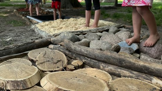 Eltern und Mitarbeiter der Kita Arche Noah haben unter gemeinsamen Krafteinsatz und mit jeder Menge Spaß und Material auf unserem Spielplatz einen Sinnespfad gebaut. Barfuß über diesen Pfad zu spazieren und zu balancieren, bietet im Kita-Alltag eine wunderbare Gelegenheit, um Körper und Geist zu entschleunigen.